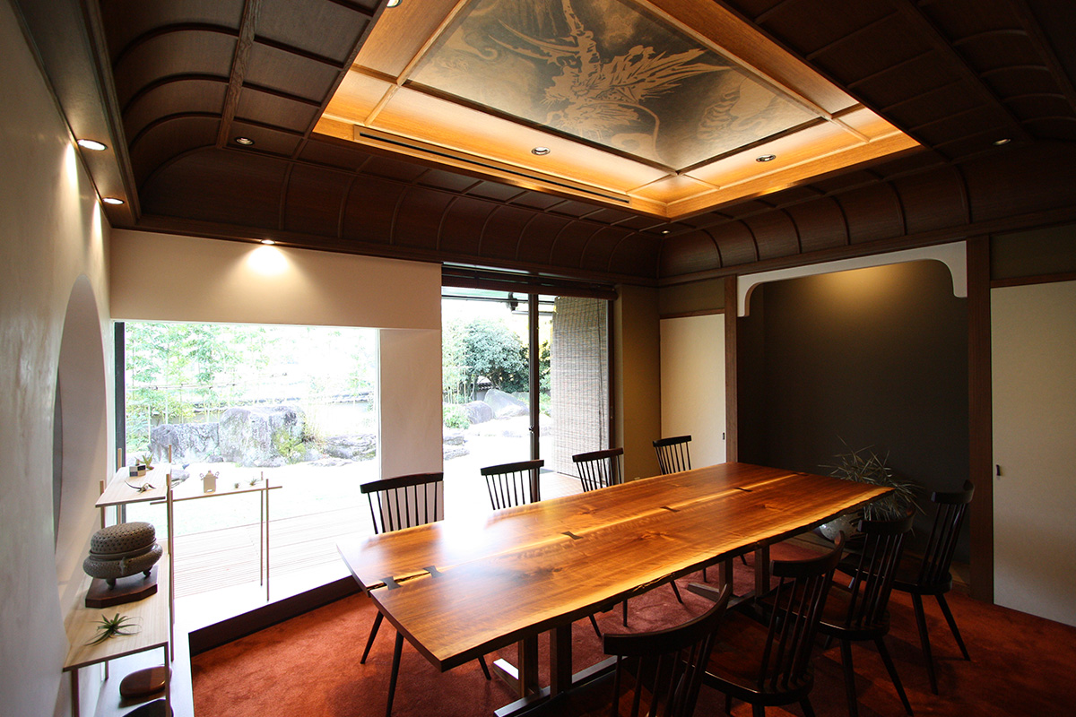 自然素材を活かしたミッドセンチュリースタイルの室内は、窓からの日本庭園の景色と融合し、ラグジュアリーな雰囲気の中にも自然の温かみを感じていただける空間となっています。和室やダイニング、縁側を備えた特別個室など、多彩なシーンに合わせたお部屋をご用意いたしました。